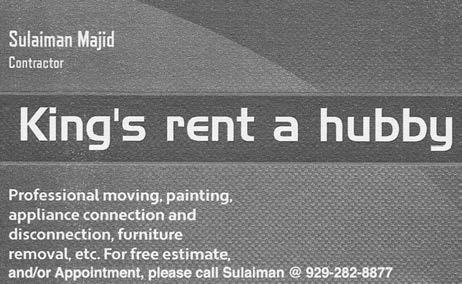 Co-op City Times / October 29, 2022 33 EMERGENCY SERVICE L & L APPLIANCE REPAIR • ALL MAKES & MODELS • Stoves • Washers • Dryers •Lamps • Dishwashers • Refrigerators • Bags • Hoses • Belts • Vacuum Cleaners Family Owned & Operated Since 1954 NYC License #1233497 Fully Insured 718.792.2655 2951 Middletown Road, Bronx, NY 10461 (Near Pelham Bay Station) 10/30/23 APPLIANCE REPAIR CAR SERVICE Executive Exotic Limo •Proms •Sports Events •Weddings •Funerals •Tours •Sweet 16 •Special Occasions •Airports•Casinos : 212-531-3792 Mobile: 917-560-6838 Toll Free: 855-369-9936 ExecutiveExoticLimo.com ExecutiveSecurityProtection.com Casino Specials Atlantic City, NJ Foxwoods, CT Empire, Yonkers Resorts, Queens 10/29 SPOONER DOMESTIC SERVICE • Basic Cleaning $100 • Deep Cleaning $150 • Non-Medical Senior Care $90 • 4 Hour Min. + 8.88% tax • Bonded • 7 Days • Cash, Pay-Pal www.spoonercleaning.com (718) 320-5112 11/26 Advertise in the Co-op City Times! Call for Rates! Ad rates from $10/week! 718-320-3300 x3384 CLEANING SERVICES HOME IMPROVEMENT LOCKSMITH CLEANING SERVICE – WINDOWS GEORGE’S CLEAN WINDOWS Professional Window Cleaning • FAST RELIABLE SERVICE Cell: 1-203-482-6337 11/12 1-800-479-2667 CO-OP SALES - JASON LASH • HANDYMAN SERVICES • RANGE HOODS • VERTICAL & MINI BLINDS • LIGHT FIXTURES • SINK VANITIES • KITCHEN CABINETS • SPACE SAVERS • CABINET REFACING • MATCHING HAMPERS • COUNTERTOPS • BATHTUB ENCLOSURES • CUSTOM CLOSET MIRROR DOORS • CLIP-ON MIRROR FRAMES • CUSTOM WALL MIRRORS We BEAT Any Quote! CO-OP SALES BLINDS! Vertical, Mini, Wood, Pleats www.co-opsales.info 10/29 Grout & CleaningCarpet Co-op City Resident Specials Breathe Easy Eliminate Bugs MARY KAY CONSULTANT Cassandra Watson-Gabbidon, Mary Kay Independent Beauty Consultant. Website: www.marykay.com/cwatson-gabbidon Phone: 954-861-0475. Mention this ad when you call. 10/29 INSURANCE PAINTING FAMILY LOCKSMITH AND BLINDS NEW STYLE BLINDS Re-installation of any types of Blinds. Repair Closet Doors and Sell New Bi-Fold Doors! 10/29 CLEANING SERVICES (CON’T) JB RYAN COMPUTER REPAIR & UPGRADE Repair – Upgrade – Data Recovery – Virus Removal Laptop Overheats Cracked Screen Broken Power Jack Transfer your cassette tape music to CDs. Call James 646-281-4475, 718-324-4332. 2/18 RECORDS WANTED Old Records Wanted. Will Pay Top $$ for JAZZ, JAZZ, JAZZ, Rock & Roll, Soul Music, Latin, 50s, 60s, & 70s. LP, 78 or 45. Call Joe 917-952-4408 11/5 CLASSIFIEDS To Advertise: 718-320-3300 x3384 cctimes@riverbaycorp.com 10/29 REUPHOLSTERY REUPHOLSTERING 718.881.7691 STYLISH DECORATORS Custom Craftsmen – 40 yrs. experience. Sofas & Chairs upholstered; Slipcovers - Fabric & Plastic; Kitchen Chairs - $8.99 & up. Caning; Venetian Blinds; Drapes - Custom 10/2910/29 10/29 HANDYMAN 10/22 12/31 O. entic Cleaning Services Residential & Commercial Cleaning -Maintenance Cleaning -Deep Cleaning -Special Projects & Organizing -Events Cleaning We provide High Quilty & Professional work (929) 215-3339 Contact@othenticcleaning.com othenticcleaning.com 100% Satisfaction Guarantee IF IT’S NOT AUTHENTIC IT’S NOT US 10/29 LAUNDRY SERVICE 11/5COMPUTER CONSULTANT & REPAIR 10/29