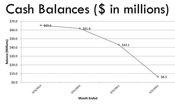 our mortgage, HCR who regulates us, and Wells Fargo, which is our lender,” Mr. Klehammer said. “So, the cash has been used to do the capital improvements. Our budgets have typically let us fund our operations. But for the capital improvements, we’ve had to use the funds that were in the bank.”