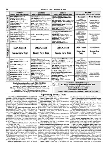 – 9:30; Einstein – 9:45; Dreiser – 10 a.m. Empire Casino – Tues., Jan. 7; $5. Bartow – 9 a.m.; Einstein – 9:15 a.m.; Dreiser – 9:30 a.m. Aldi/Home Depot – Wed., Jan. 8; $3. Bartow – 9:30; Einstein – 9:45; Dreiser – 10 a.m. Central Ave. – Wed., Jan. 8; $13. Christmas Tree store, Trader Joe’s and Amazing Savings. Bartow – 8:30; Einstein – 8:45 a.m.; Dreiser 9 a.m. There is a Shoprite right next door to Amazing Savings Walmart – Thurs., Jan. 9; $15. Bartow – 8:30; Einstein – 8:45; Dreiser 9 a.m. Costco – Thurs., Jan. 9; $5. Bartow – 9:30; Einstein – 9:45; Dreiser – 10 a.m. Wegman’s Supermarket, Brooklyn New York – Tues., Jan. 14; $10. Bartow – 8:30; Einstein – 8:45; Dreiser – 9 a.m. Wait list. Fairway/BJ’s – Wed., Jan. 15; $4. Bartow – 9:30; Einstein – 9:45; Dreiser – 10 a.m. Want to learn how voice technology can keep you connected to your community? Join us for a free presentation “Introducing Your Connected Community” Alexa project. JASA main office, 2049 Bartow Avenue, Friday, Jan. 17; 10 – 11 a.m. Due to limited seating in the Bartow main office, please call to register, only 40 seats available, 718-320-2066. Dreiser Loop Senior Center, 177 Dreiser Loop, rm. 4; Jan. 17; 12:30 – 1:30 p.m. 50 seats available. JASA will be closed Monday, January 20 in observance of Martin Luther King Jr’s birthday. Empire Casino – Tues., Jan. 21, $5. Bartow – 9