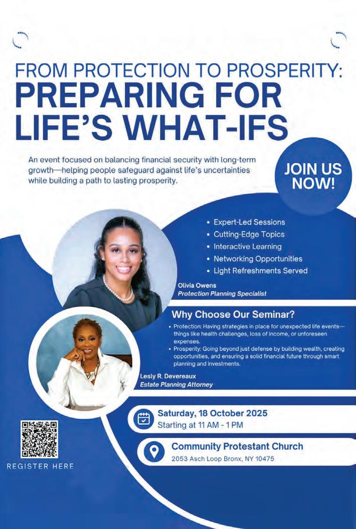 Rev. Dr. Sheldon E. Williams and the Co-op City Baptist Church family invite you to join us for Worship Service tomorrow at 8 a.m., in-person only, and at 11a.m., in-person and on Zoom or YouTube. Sunday School classes for all ages will be held at 9:30 a.m. We are located at 135 Einstein Loop, Rm. 50 (lower level), Bronx, NY 10475. Telephone: 718-320-3774. Email: ccbc135@ optimum.net or coopcitybc@gmail.com. Website: www.coopcitybaptistchurch. org. Masks are optional.