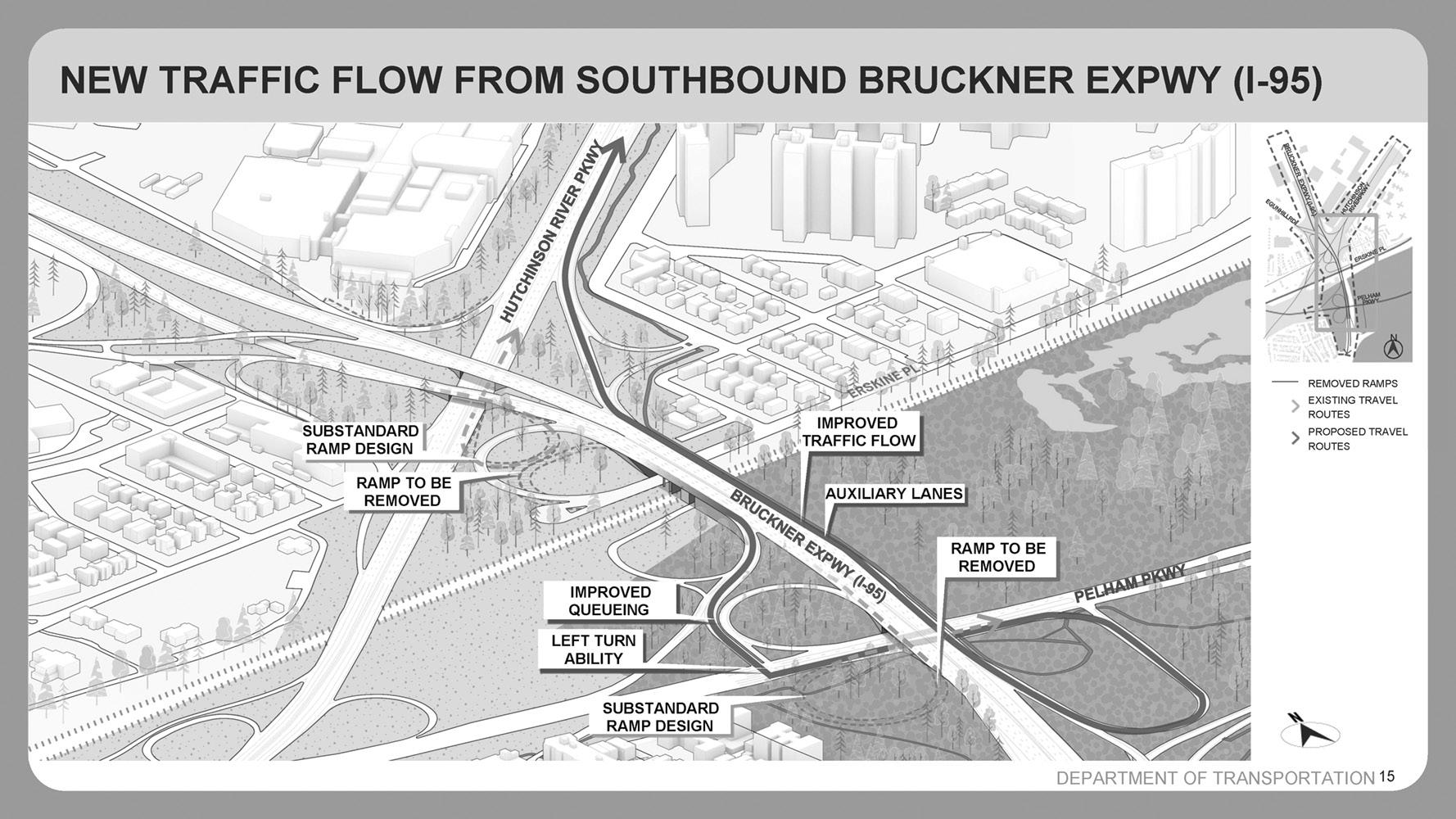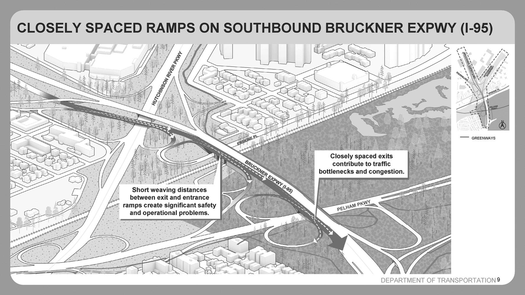 New York State Department of Transportation’s (NYSDOT) Phase 2 of the Bruckner Expressway Mobility Improvements Project includes a proposal to close Exit 9 on the southbound I-95 which will impact drivers who use the exit ramp to connect to the northbound Hutchinson River Parkway, and especially Co-op City shareholders’ access to Section 5 at Erskine Place.