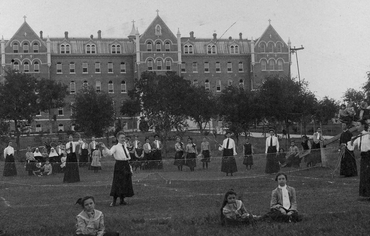 En 1909, la Madre Mary John O’Shaughnessy propuso que la Academia del Verbo Encarnado se expandiera al nivel universitario, ya que las mujeres no eran aceptadas en las universidades y colegios dirigidos por hombres para hombres. Las clases universitarias comenzaron en 1910. Fotografía tomada en el césped frente a la Casa Madre / Academia.