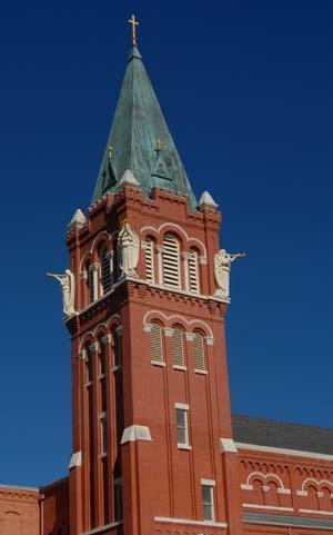Diseñada en estilo románico, la estructura terminada era un edificio imponente en el área circunvecina, el cual era de ladrillo rojo con revestimientos de piedra caliza blanca. El altísimo campanario con cuatro ángeles trompeteros fue en su momento la estructura más alta de la ciudad, y el monumento podía verse desde cualquiera dirección.