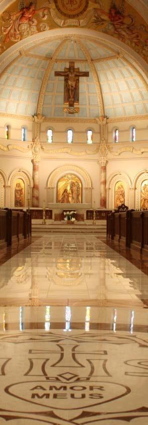 ““La vista del interior desde la puerta principal es de una belleza exquisita; las catorce columnas de escayola, con capiteles románicos dorados, sostienen el techo abovedado de metal repujado. Los catorce vitrales emplomados, cada uno de ellos una joya del arte, reflejan una luz tenue sobre toda la capilla. Alrededor de la pared posterior del santuario corre un pergamino con la leyenda: O Mysterium Ineffabile, O Charitatis Sacramentus Admirabile, Hic Est Panis Vitae. Hic Est Cibus Animae.