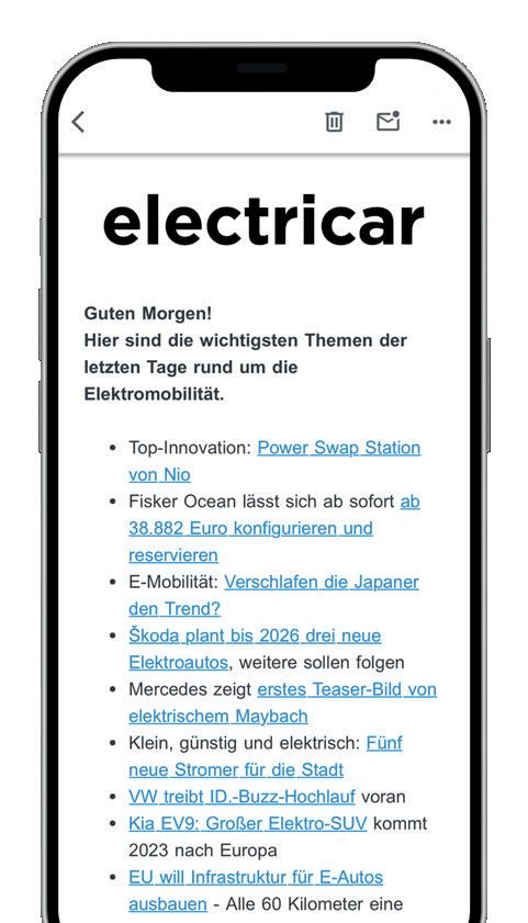 Das electricar Briefing erscheint aktuell wöchentlich. Entscheiden Sie selbst, welche Themen Sie interessieren und wo Sie gerne weiterlesen möchten. Beim nächsten Office- oder Kunden-Smalltalk geben Sie mit diesen News die Themen vor.