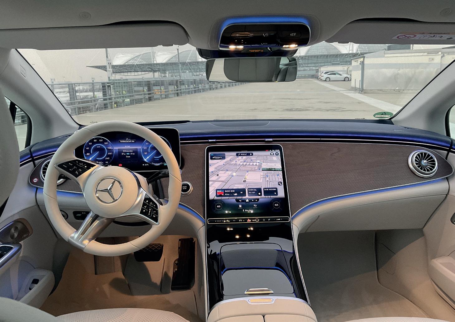 Das Innere ist reduziert, in einem schwarzen Kunststoffband hinter dem Lenkrad läuft das Display mit den wichtigsten Informationen.