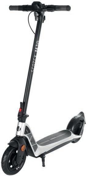 Der auf den Namen H10 getaufte Elektroscooter der Marke Scotex ist mit 8,5 Zoll großen Luftreifen versehen, die zuverlässig kleinere Fahrbahnuneben heiten ausgleichen. Ausgestattet mit einer Trommel bremse am Vorderrad und einer elektrischen Bremse hinten überzeugte uns der H10 beim Bremsverhalten am meisten. Weniger als vier Meter benötigte er beim Bremstest, um zum Stillstand zu kommen. Eine vollständige Akkuladung reicht laut Herstellerangaben für eine Strecke von 30 Kilometern. Diesen Wert konnten wir zwar nicht ganz erreichen, jedoch schaffte der Scooter mehr als 27,5 Kilometer, bevor er wieder an die Steckdose musste.