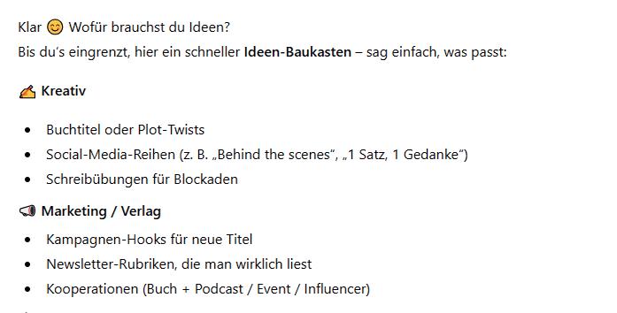 Darüber hinaus eignet sich Offline-KI für kreatives Arbeiten im kleinen Rahmen. Ideen lassen sich weiterdenken, Texte neu strukturieren oder alternative Formulierungen vor-