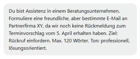Die Eingabe an eine KI – also Frage, Anweisung oder Beschreibung. Klar formulierte Prompts führen zu besseren Ergebnissen.