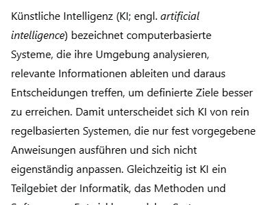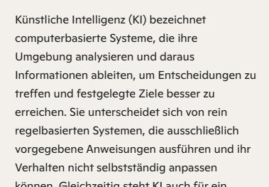 Wer eine besonders griffige Definition für KI sucht, der verwendet vielleicht die von Bitkom: „Künstliche Intelligenz ist die Eigenschaft eines IT-Systems, ‚menschenähnliche‘, intelligente Verhaltensweisen zu zeigen.“ Damit haben wir schon einmal die Sache griffig definiert, ohne endlos lange Abhandlungen schreiben zu müssen.