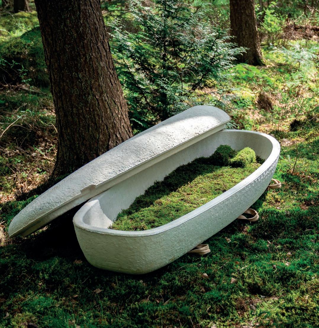 Der wasserfeste „Loop Living Cocoon“ wächst innerhalb einer Woche in einer Zuchtanlage aus lokalen Pilzarzten und Upcycling-Han asern im niederländischen Delft. Er ist zu 100 Prozent natürlich und Green-Leave-zertifiziert. Innen ist er mit einem weichen Moosbett ausgestattet. Er ist in zwei Farbversionen – „Calm“ und „Wild“ – erhältlich, hat sechs Jutegri e. Der erste lebende Sarg kann bei traditionellen Bestattungen, Naturbestattungen und Einäscherungen zum Einsatz kommen und wird europaweit ausgeliefert. Ein wichtiger Aspekt für Firmengründer Bob Hendrikx ist auch, dass mit dem Cocoon keinerlei Chemikalien in den Boden gelangen und so Umweltbelastungen durch Bestattungen reduziert werden können.