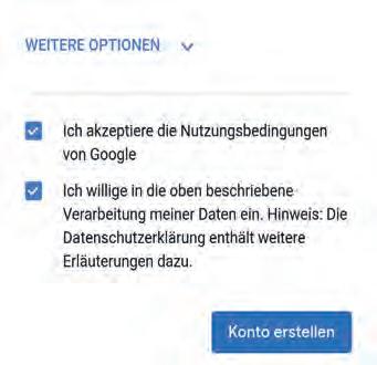 Bevor Ihr Google Account endgültig erstellt wird, müssen Sie noch die Nutzungsbedingungen und Datenschutzbestimmungen akzeptieren. Wenn Sie diese akzeptieren, setzen Sie ein Häkchen durch Antippen der jeweiligen Zeile f Danach tippen Sie auf „Konto erstellen“ g . Nach wenigen Augenblicken ist Ihr Konto eingerichtet und Sie können dieses sofort benutzen.