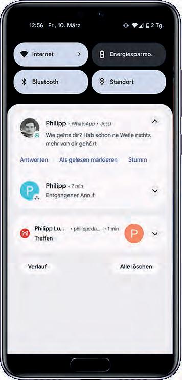Mit einer einfachen Wischbewegung von der oberen Displaykante können Sie dieses Untermenü öffnen - und das von überall aus. Auch wenn Sie sich in einer App befinden, lässt sich dieses Menü aufrufen. Die Schnelleinstellungen, im Fachjargon auch oftmals Shortcuts genannt, sind kleine Helferlein, die Sie im Zuge der Smartphone-Benutzung immer wieder benötigen. Egal ob Sie nun WLAN oder Bluetooth ausschalten, den Flugmodus aktivieren oder den Kamera-Blitz als Taschenlampe verwenden möchten. Direkt darunter finden Sie die Benachrichtigungen aufgelistet, die Ihnen von den unterschiedlichsten, auf dem Smartphone installierten Apps gesendet werden. Auf den nächsten Seiten zeigen wir Ihnen, wie Sie dies alles verwalten können.