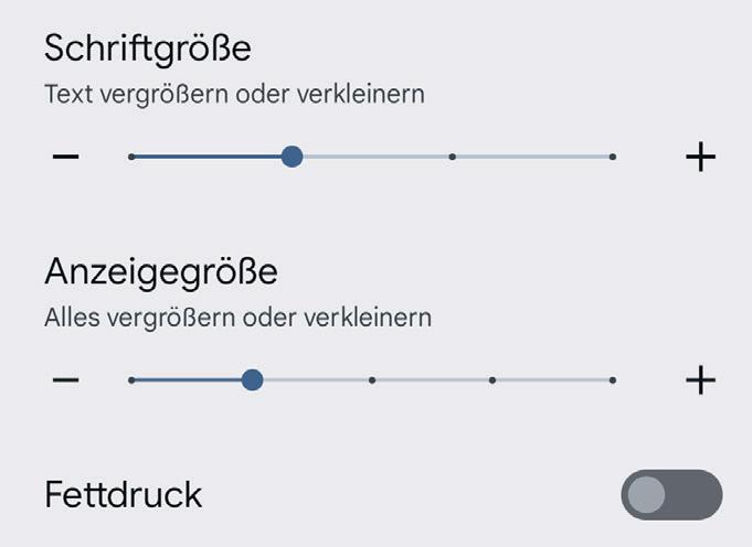 Im Menü „Display“ tippen Sie zunächst auf „Anzeigegröße und Text“ und wählen dann den Punkt „Schriftgröße“ aus. Über den Schieberegler b ändern Sie die Schriftgröße nach Belieben.