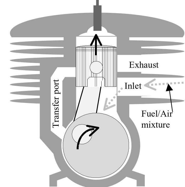 When the piston is at the top of its stroke and the mixture in the cylinder is compressed the ignition fires and drives the piston back down. As the piston moves down the exhaust port is opened allowing the pressurised exhaust gases to escape. As the piston moves further down the inlet port is closed and the air/fuel mixture already in the crankcase is compressed.