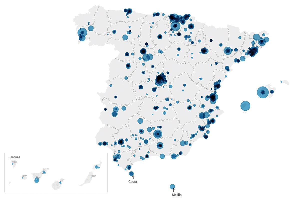 Cada punto representa una de las 833 empresas españolas del sector con cuentas presentadas entre 2021 - 2023. El tamaño depende de su facturación.