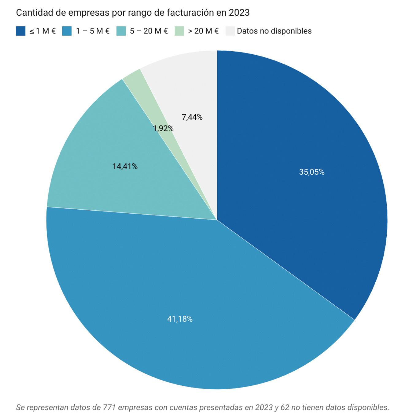 Analizamos las empresas por tramos de facturación. Si se excluyen las 62 empresas de las cuáles no están disponibles sus datos de facturación en 2023, las 16 empresas que más facturan (por encima de 20 millones) aportan el 21,77 % total del sector; lo que significa que el 1,9 % del total de empresas tiene casi un cuarto de la cuota del mercado —excluyendo a las multinacionales—.