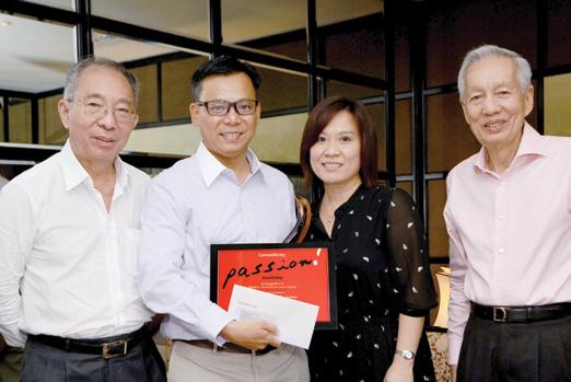 Passion! Winner, Chan Kim Teck, Jimmy (second from left), together with his wife, Nguyen Thi Kim Thuy, Jenny, receiving his award at a lunch hosted by MD/GCEO Kua Hong Pak (right), with special attendance by Chairman, Lim Jit Poh (left).