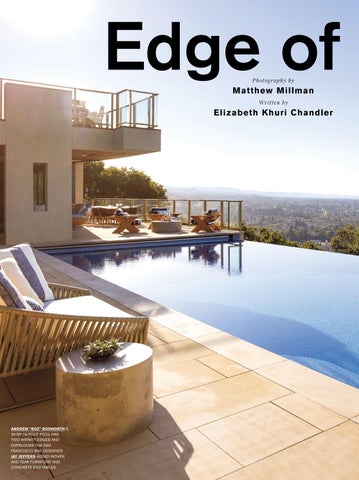 ANDREW “BOZ” BOSWORTH’S 39-BY-19-FOOT POOL HAS TWO INFINITY EDGES AND OVERLOOKS THE SAN FRANCISCO BAY. DESIGNER JAY JEFFERS ADDED WOVEN AND TEAK FURNITURE AND 33 CONCRETE END TABLES.