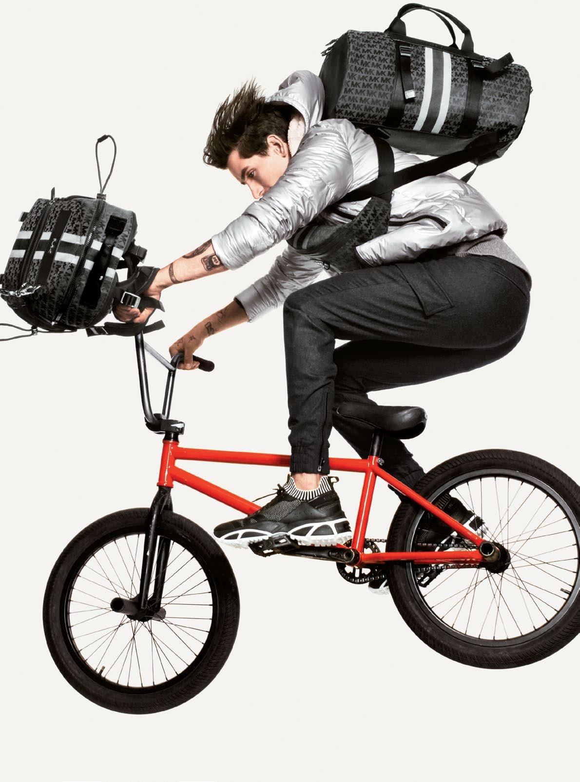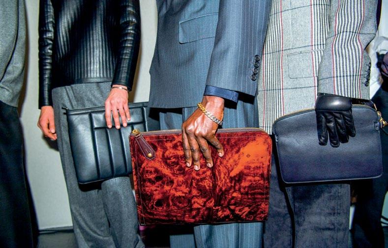 p.30 Fendi silver prints on FF logo men’s bag, $2,300; fendi.com. Bally Cage Sling bag, $950; bally.com. Prada bag, $1,150, Prada, Beverly Hills, 310- 278-8661. Salvatore Ferragamo belt bag, $995; ferragamo.com. Valentino Garavani Undercover men’s bag, $1,375, Valentino, Beverly Hills, 310-247-0103.