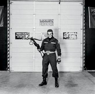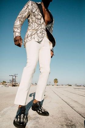 p.28 Fendi blue organza chain shirt and blue viscose pants with chain detail, prices upon request; fendi. com. Cartier sunglasses, $1,145; cartier.com. Burberry black tri-tone tailored trousers, $820, and black leather oxford brogues, $890; us.burberry.com. Dior Men black technical cotton moire taffeta shawl collar oblique tuxedo jacket, with detachable scarf, $2,400, black technical cotton moire taffeta high-waist pants, $890, and derby shoes in black leopard print calfskin, $1,450, Dior Men, Beverly Hills, 310-247-8003. Alexander McQueen ivory light wool silk and black faille reverse tuxedo jacket with crystal chandelier embroidery, price upon request, ivory light wool silk high waisted cigarette trousers, $1,280, and leather shoes, price upon request, Alexander McQueen, Beverly Hills. 323782-4983. Giorgio Armani suit, $2,695, Giorgio Armani, Beverly Hills, 310-271-5555; armani.com. Buck Mason Costa T-shirt in black, $42; buckmason.com. No. 21 by Alessandro Dell’Acqua white patent boots, $995; numeroventuno.com/en-us/.