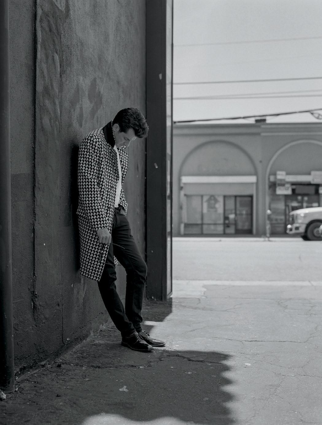p.44 Celine 3 Buttons Hedi Mac in yellow and black Tabby pattern jacquard coat, $3,950, classic white shirt with modern collar in white poplin, $590, and 3 Pleats leather Aveyron deep fix tie in black, $790, Celine, Beverly Hills, 310-888-0120; celine.com. Jacques Marie Mage Molino Noir sunglasses, $525; jacquesmariemage.com. p.46 Balenciaga black coated Incognito trench, $3,500, and black cashmere rib knit long sleeve turtleneck, $1,290, Balenciaga, Beverly Hills, 310-854-0557. p.47 Saint Laurent by Anthony Vaccarello Striped Shearling Jacket, $6,900, and black T-shirt, $350; ysl.com. p.48 Gucci Malbec fluid drill jacket, $2,500, and Malbec fluid drill pants, $780, Gucci, Beverly Hills, 310-278-3451; gucci.com. Gucci CampCollar Webbing-Trimmed satin shirt, $1,200; mrporter. com. p.49 Michael Kors Collection wool and cotton shearling-lined coat, $3,990; michaelkors.com. Sandro cotton T-shirt in white, $115; sandro-paris.com.Frame L’Homme Slim pants in oat, $210; frame-store.com. p.50 Versace striped blazer, $3,725, and GV print trousers, $1,595; versace.com. Sandro fine knit polo shirt in black, $245; sandro-paris.com. p.51 Louis Vuitton Africa houndstooth car coat, $1,480, and Staples Edition inside out T-shirt, $600, Louis Vuitton, Beverly Hills, 310-8590457; louisvuitton.com. Jacques Marie Mage Dealan Noir sunglasses, $525; jacquesmariemage.com. Jimmy Choo black shiny calf shoes with studs, similar styles available, from $950; jimmychoo.com. p.52 Prada jacket, $4,400, Prada, Beverly Hills, 310-278-8661. Michael Kors Collection Drop Needle turtleneck, $390; michaelkors. com. P.53 Bottega Veneta jacket in wool, $2,900, and pants in wool, $1,350; bottegaveneta.com. Gucci CampCollar embellished satin shirt, $1,100; mrporter.com. Dior Men boots in black smooth calfskin and technical fabric, $1,200, Dior, Beverly Hills, 310-859-4700.