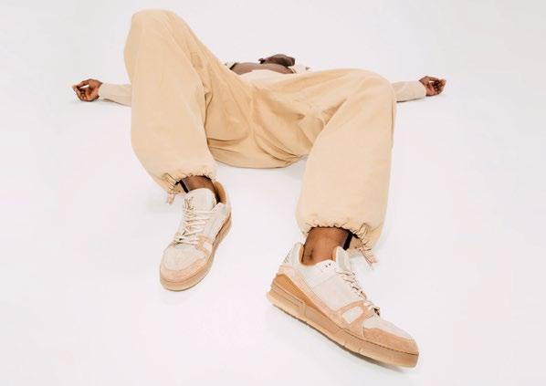 p.16 Saint Laurent by Anthony Vaccarello striped shearling jacket, $6,900; ysl.com. Louis Vuitton Men double layer coat, $6,555, cargo 3d pockets pants, $3,000, and LV skate suede calf leather shoes, $1,190, Louis Vuitton, Beverly Hills, 310- 859-0457; louisvuitton.com.