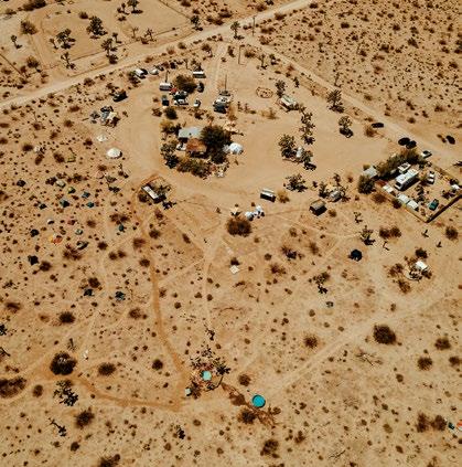 Clockwise from top left: An aerial view of a SECULAR SABBATH gathering in Joshua Tree. Inflatable mushrooms by