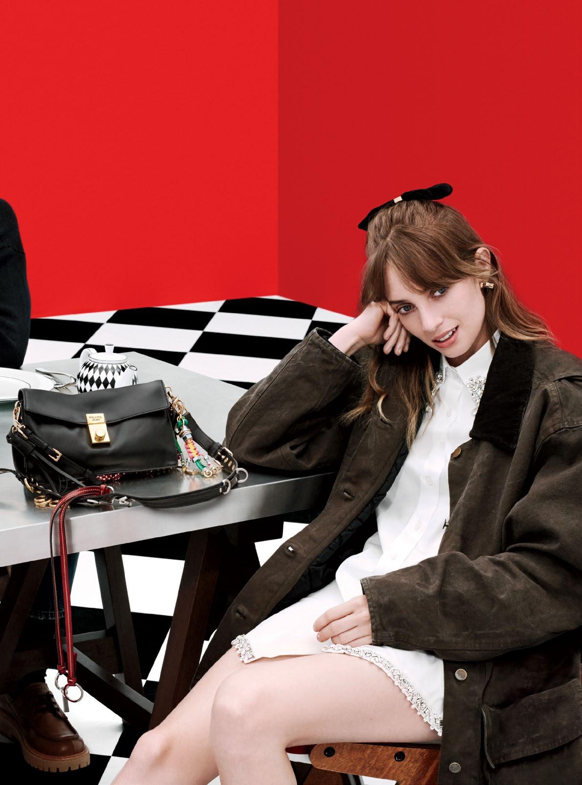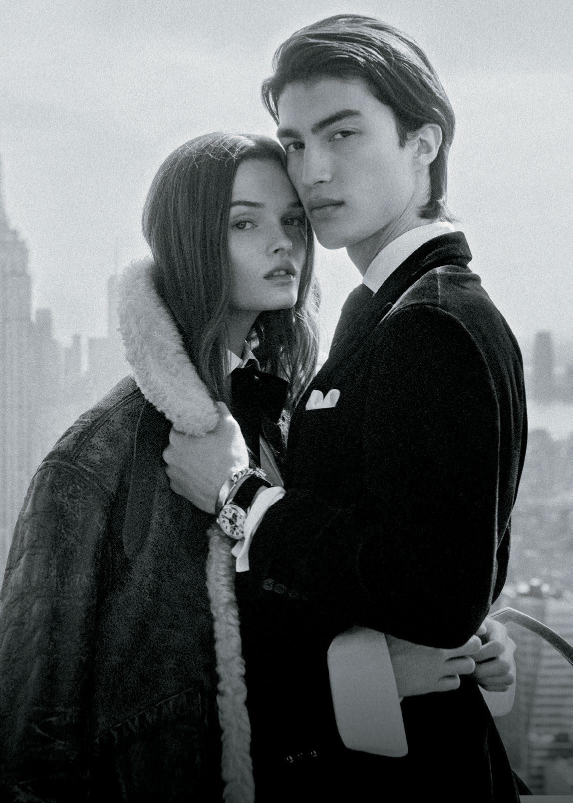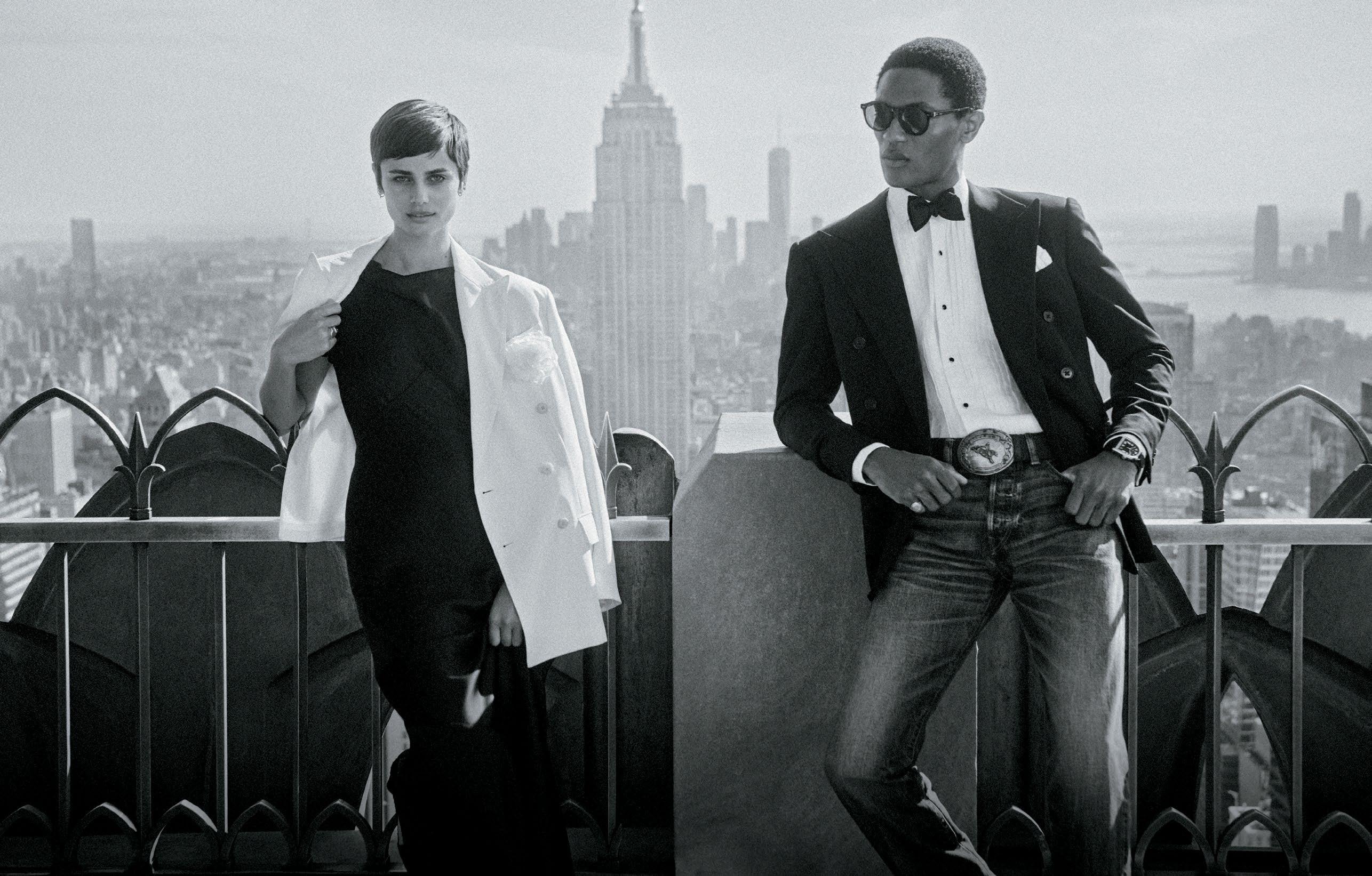 Myever wears RALPH LAUREN top, $2,990, skirt, $3,490, and bag, $4,690. HARRY WINSTON rings, bracelet, and watch, prices upon request. Presley wears RALPH LAUREN jacket, $2,495, pants, $595, shirt, $495, tie, $235, and cuffs, $390 and $450.