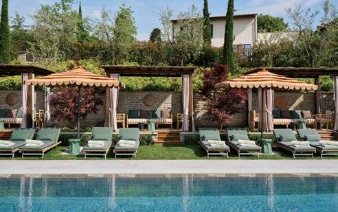 Clockwise from top right: Cheers with glassware galore in one of the 16th-century Collegio’s light-filled suites; find time for an indulgent soak in the enormous bathrooms; take time out from tours of the Duomo, the Uffizi, and the Ponte Vecchio to lounge by the hotel’s clubby poolside and relax in its shady gardens.