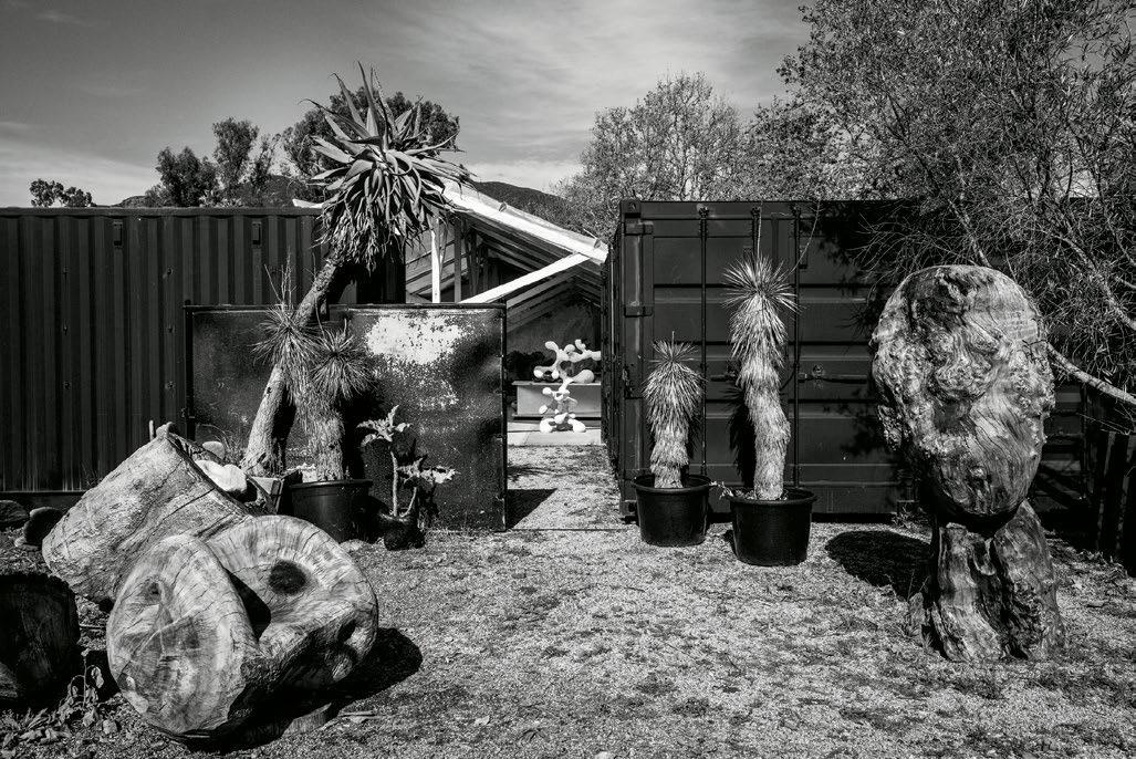 Opposite, from top: For additional storage at his greenhouse studio, Gregory uses matte black industrial containers; his sculptures dot the 10-acre property surrounding his Malibu workspace.