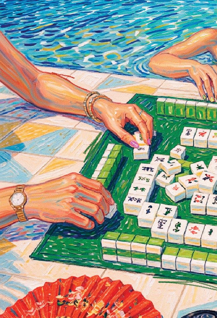 For the floors, the couple commissioned Cuban artist Jorge Pardo, a friend since Govan was director at Dia Art Foundation on the East Coast, who handcrafted an abstract dreamscape of nearly 250,000 ceramic tiles in aquatic shades ranging from pale aqua to marigold. The tiles flow through the entire 1,900-foot-house and gradually deepen in tone as you progress through the property. Their production took eight months. “People would ask, ‘How’s the house coming?’ ” Ross says. “I’d say, ‘Oh, we’re still waiting for our tiles.’ And they’d be like, ‘How long does it take for a tile?’ And I was like, ‘They’re not your average tile.’ ” Indeed, each individual tile had to be hand-painted, then placed on mats that were painstakingly fitted like a puzzle. The result looks both mystic and microbial. “We didn’t even know if it would be comfortable,” Govan says of the floors. “It was so crazy when we looked at it, like how are we going to live with that?” But as he told Ross, “What are we going to do, put down gray carpeting?” Absolutely not, Ross says. “We are not the gray carpeting people.” (Local fashion designer turned textile wiz Gregory Parkinson was enlisted for gloriously comfy — and colorful — nubby rugs in the living room and bedrooms.)
