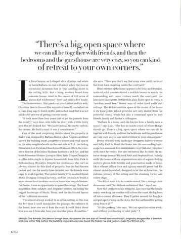 n Toro Canyon, an L-shaped slice of prime real estate in Santa Barbara, no one is stunned when they see an occasional mountain lion or bear ambling about in the rolling hills. But a boxy, modern board-form concrete house, sited in the center of 150 acres of untouched wilderness? Now that turns a few heads. The homeowners, film producer John Lesher and his wife, Christina Liao (a former film executive herself), embarked on a years-long saga to build on this untouched land that was not unlike the process of getting a movie made. “It took more than four years just to get the permits from the county,” says Liao, who tells the story with a little levity now that it’s behind her. “We had to install the septic system, the cistern. We built a road. It was a commitment.” One of the most surprising details about the property is that it was designed by Barbara Bestor, a Los Angeles architect known for building smart, progressive homes and retail spaces in the artsy neighborhoods on the east side of L.A., including Silverlake, Los Feliz and Beachwood Canyon. She’s the executive director of the Julius Shulman Institute at SCI-Arc, and her book Bohemian Modern: Living in Silver Lake (Harper Design) is a coffee table staple in hipster households from Echo Park to Williamsburg, Brooklyn. Despite her credentials, she isn’t an obvious choice for this kind of property, but she had known Lesher and Liao for nearly three decades, and the friends were eager to work together. The Lesher family lives in a traditional 1930s Georgian Colonial in town, and the decision to build a more streamlined modern vacation home was very deliberate. For Bestor, it was an opportunity to spread her wings. She found inspiration from unlikely and disparate sources, including the rugged landscape of Marfa, Texas, and the traditional layout of the California missions. “I’ve almost always worked in an urban setting, so this was the first time I could manipulate the passage, the entrance to the home, how you see it from the road. I could think about how you see it from afar, how you view that piece of coastline,”