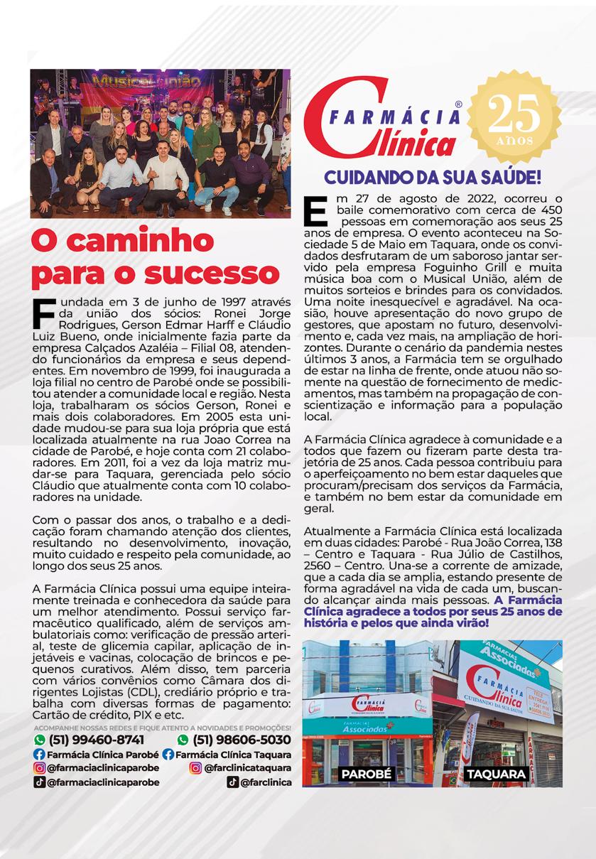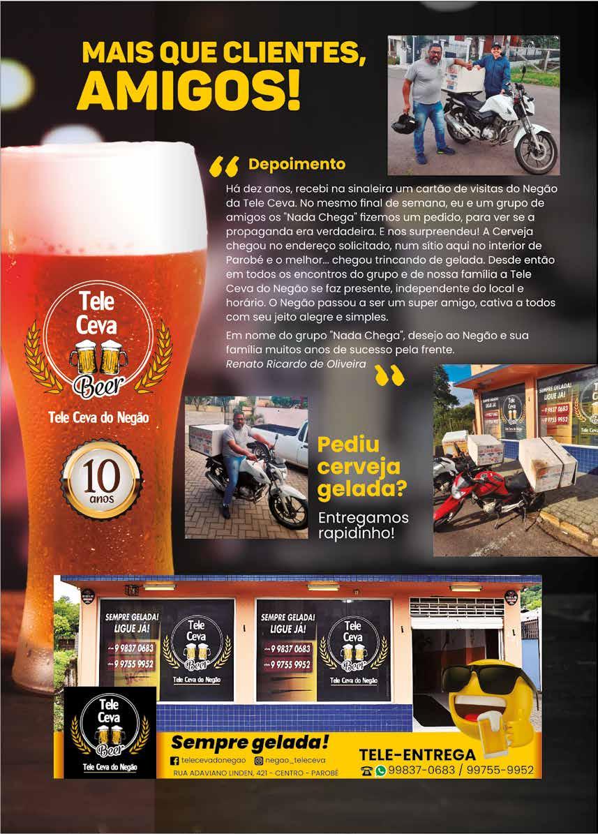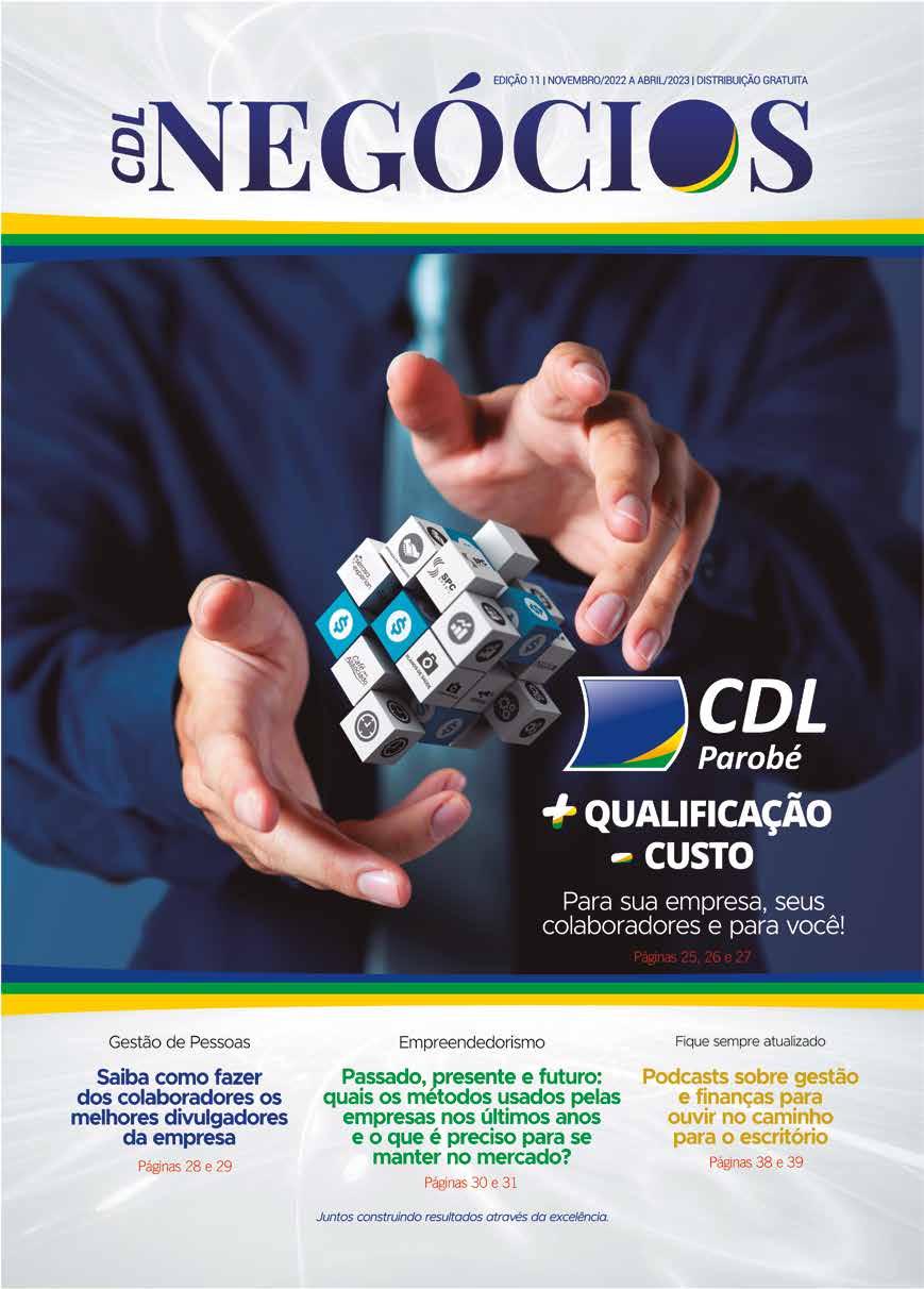 Publicação da CDL de Parobé, dirigida ao setor empresarial e ao público em geral. Contatos: (51) 3543-1625 e 3543-1486 Site: www.cdlparobe.com.br E-mail: cdlpar@tca.com.br Endereço: Rua João Alfredo Feltes, 115 Bairro Guarujá | CEP 95630000 Parobé/RS Ilustração de capa: DVS Publicidade Tiragem: 5.000 exemplares Jornalista: Nadine Laís Funck - MTB 0020594/RS Fotos: CDL Parobé Projeto gráfico: DVS Publicidade Correção ortográfica: Ana Paula Halmel dos Santos Impressão: Grafocem Impressos Gráficos Ltda Sugestões podem ser encaminhadas à CDL de Parobé. Os ar tigos assinados não representam, necessariamente, o pensa mento da CDL. Não é permitida a reprodução parcial ou total dos artigos publicados na revista sem a prévia autorização do editor. NOVEMBRO/22 JANEIRO/23 DEZEMBRO/22 MARÇO/23 MAIO/23 NOVEMBRO/22 FEVEREIRO/23 ABRIL/23 Finados Confraternização universal Natal Plebiscito (SUJEITO A ALTERAÇÃO PELA PREFEITURA DE PAROBÉ) Dia do Trabalhador Proclamação da República Carnaval Tiradentes