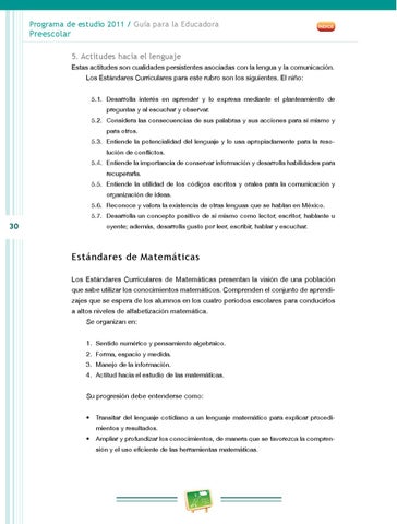 5. Actitudes hacia el lenguaje Estas actitudes son cualidades persistentes asociadas con la lengua y la comunicación. Los Estándares Curriculares para este rubro son los siguientes. El niño: 5.1. Desarrolla interés en aprender y lo expresa mediante el planteamiento de preguntas y al escuchar y observar. 5.2. Considera las consecuencias de sus palabras y sus acciones para sí mismo y para otros. 5.3. Entiende la potencialidad del lenguaje y lo usa apropiadamente para la reso lución de conflictos. 5.4. Entiende la importancia de conservar información y desarrolla habilidades para recuperarla. 5.5. Entiende la utilidad de los códigos escritos y orales para la comunicación y organización de ideas. 5.6. Reconoce y valora la existencia de otras lenguas que se hablan en México. 5.7. Desarrolla un concepto positivo de sí mismo como lector, escritor, hablante u