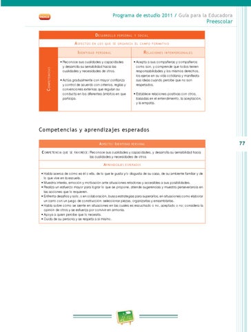 • Habla acerca de cómo es él o ella, de lo que le gusta y/o disgusta de su casa, de su ambiente familiar y de lo que vive en la escuela. • Muestra interés, emoción y motivación ante situaciones retadoras y accesibles a sus posibilidades. • Realiza un esfuerzo mayor para lograr lo que se propone, atiende sugerencias y muestra perseverancia en las acciones que lo requieren. • Enfrenta desafíos y solo, o en colaboración, busca estrategias para superarlos, en situaciones como elaborar un carro con un juego de construcción: seleccionar piezas, organizarlas y ensamblarlas. • Habla sobre cómo se siente en situaciones en las cuales es escuchado o no, aceptado o no; considera la opinión de otros y se esfuerza por convivir en armonía. • Apoya a quien percibe que lo necesita. • Cuida de su persona y se respeta a sí mismo.