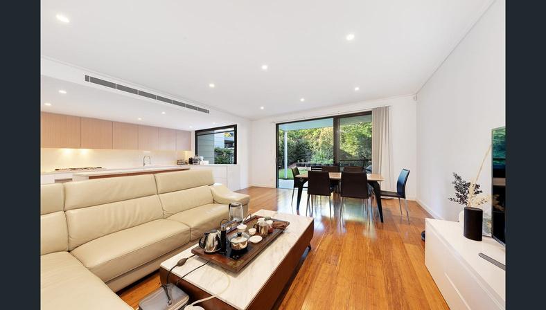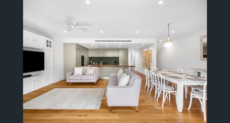 The large, open plan kitchen, living and dining area flows seamlessly to the alfresco entertaining area and north facing grassed courtyard and garden at the rear A separate lounge room opens onto a charming balcony overlooking the rolling verdant parklands and lake.