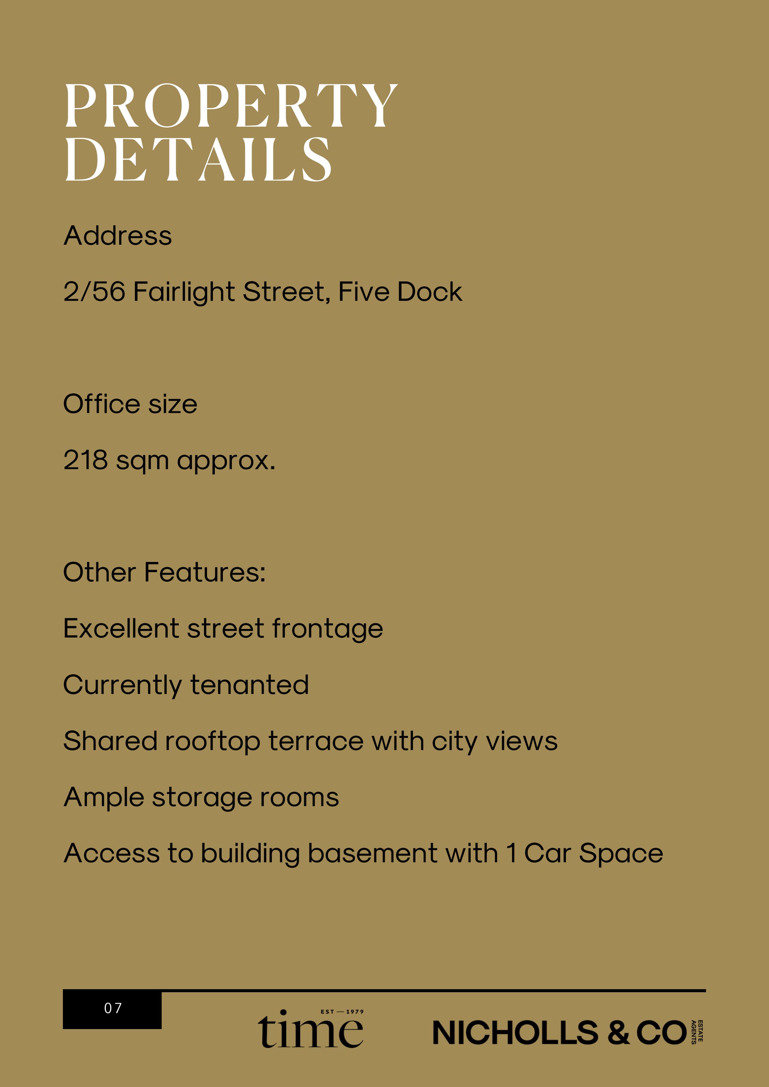 • 218 sqm on title, which includes storage rooms, bathrooms, courtyard and x1 car space.