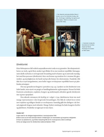 Direktoriet Etter Robespierres fall vedtok nasjonalkonventet enda en ny grunnlov. Revolusjonstrettheten var sterk, og de fleste ønsket å gå tilbake til en mer moderat republikk. Statsapparatet skulle nå bestå av en lovgivende forsamling med to kamre og en utøvende myndighet med fem personer (direktoriet). Krav om formue og eiendom for å stemme ble gjeninnført, og myndighetene slo hardt ned på alle former for ekstremisme. Frankrike ville ikke ha et nytt kongedømme, men heller ingen revolusjonær republikk basert på jakobinske prinsipper. Den nye grunnloven fungerte i perioden 1795–99. I praksis var det direktoriet som ledet landet, men styret var preget av handlingslammelse og korrupsjon. Presset fra både frustrerte aristokrater, rojalister, borgere og misfornøyde arbeidere gjorde direktoriet mer og mer upopulært. Den økende misnøyen slo kraftig ut i valget i 1799. Jakobinerne kom inn med mange representanter i den lovgivende forsamlingen. Der fikk de vedtatt lover rettet mot rojalister og tidligere fiender av revolusjonen. Samtidig gikk det dårligere i de fortsatt pågående krigene med utlandet. Mange fryktet statskupp fra både kongetro krefter og jakobinere. Frankrike var igjen på vei inn i kaos. Husker du? 1 Gjør rede for de viktigste begivenhetene i revolusjonsåret 1789. 2 Nevn noen av de mest sentrale ideene i Erklæringen om menneskets og borgerens rettigheter. 3 Hvem var jakobinerne, og hvilken betydning fikk de for revolusjonens videre utvikling? 4 Hva var bakgrunnen for direktoriets maktovertakelse i 1795?