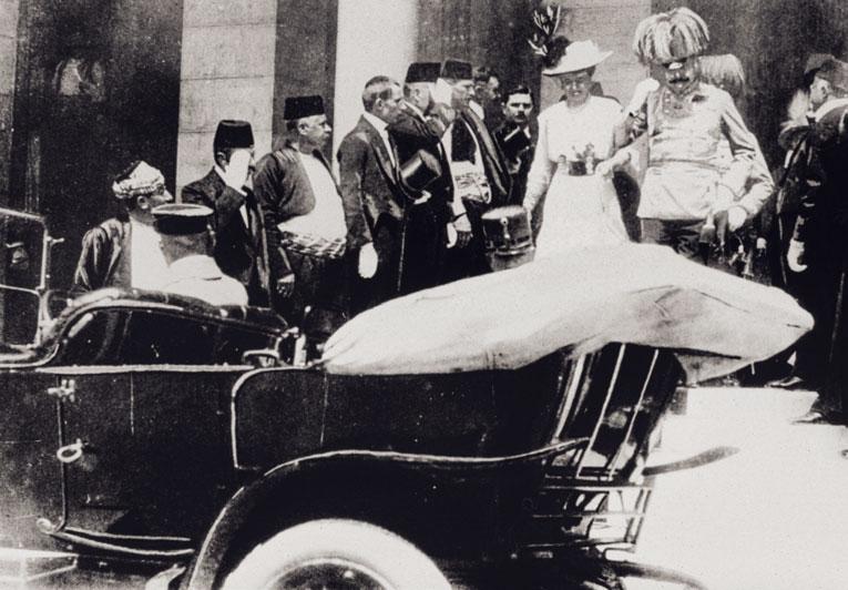 Erkehertug Franz Ferdinand med sin kone på vei ned trappene fra rådhuset i Sarajevo, kort tid for attentatet. Foto: Alamy