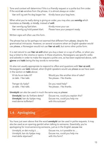 1.4 Apologising You have just seen above that the word unnskyld can be used in polite requests. It may also be used as an opening gambit when talking to someone. Essentially, you’re apologising for inconveniencing someone, just as in the English excuse me: Unnskyld, er det mulig å … Unnskyld, kan du hjelpe meg med dette skjemaet?