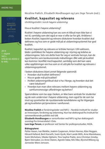 Kvalitet, kapasitet og relevans er kritiske hensyn i UH-sektoren, både i politikken for høyere utdanning og i styring og ledelse av utdanningene. Selv om dette hver for seg er sentrale hensyn, kan de også framtre som konkurrerende målsettinger. Økt vekt på kvalitet kan komme i konflikt med kapasitet, samtidig som det kan være ulike oppfatninger om hva som er et uttrykk for kvalitet og relevans i utdanningssystemet. I boken diskuteres blant annet følgende spørsmål: • Hvordan skal kvalitet defineres? • Hva er gode mål på kvalitet? • Hvilket utdanningstilbud skal vi ha i Norge, og hvordan skal det være lokalisert? • Hvordan kan man sikre relevans mellom høyere utdanning og samfunnsmessige utfordringer og behov? Spørsmålene som tas opp i boken, er ikke bare sentrale for studenter og de som underviser i høyere utdanning, men også for de som tar imot og sysselsetter de nyutdannede kandidatene og for tilgangen på og kvaliteten på tjenestene i samfunnet. Nicoline Frølich er forskningsleder ved NIFU – Nordisk Institutt for studier av Innovasjon, forskning og utdanning. Hun har doktorgrad fra Institutt for sammenliknende politikk ved UiB. Elisabeth Hovdhaugen er seniorforsker ved NIFU og har doktorgrad i sosiologi fra Universitetet i Oslo. Lars Inge Terum, er professor ved Senter for profesjonsstudier, HiOA. Bidragsytere: Petter Aasen, Ivar Bleiklie, Joakim Caspersen, Anton Havnes, Kåre Heggen, Håvard Helland, Berit Karseth, Svein Kyvik, Mari Lande With, Arne Mastekaasa, Svein Michelsen, Vibeke Opheim, Tine Sophie Prøitz, Jens-Christian Smeby, Bjørn Stensaker, Liv Anne Støren, Agnete Vabø, Nils Vibe, Øyvind Wiborg og Jannecke-Wiers-Jenssen.