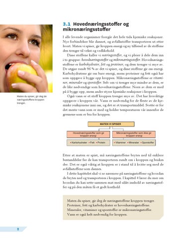 Etter at maten er spist, må næringsstoffene brytes ned til enklere bestanddeler før de kan transporteres rundt om i kroppen og brukes der. Det er også viktig at kroppen er i stand til å kvitte seg med de avfallsstoffene som dannes. I dette kapittelet skal vi se nærmere på næringsstoffene og hvordan de brytes ned og transporteres i kroppen. I kapittel 4 lærer du mer om hvordan du kan sette sammen mat med ulikt innhold av næringsstoffer og på den måten få et godt kosthold.