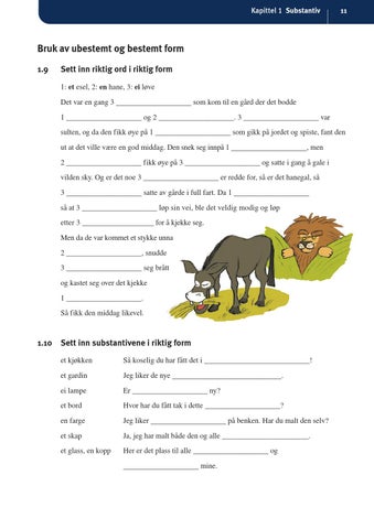 Sett inn riktig ord i riktig form 1: et esel, 2: en hane, 3: ei løve Det var en gang 3 ____________________ som kom til en gård der det bodde 1 ____________________ og 2 ____________________. 3 ____________________ var sulten, og da den fikk øye på 1 ____________________ som gikk på jordet og spiste, fant den ut at det ville være en god middag. Den snek seg innpå 1 ____________________, men 2 ____________________ fikk øye på 3 ____________________ og satte i gang å gale i vilden sky. Og er det noe 3 ____________________ er redde for, så er det hanegal, så 3 ____________________ satte av gårde i full fart. Da 1 ____________________ så at 3 ____________________ løp sin vei, ble det veldig modig og løp etter 3 ___________________ for å kjekke seg. Men da de var kommet et stykke unna 2 ____________________, snudde 3 ____________________ seg brått og kastet seg over det kjekke 1 ____________________. Så fikk den middag likevel.