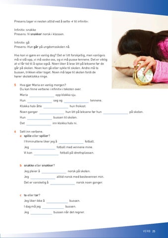 Presens lager vi nesten alltid ved å sette -r til infinitiv: Infinitiv: snakke Presens: vi snakker norsk i klassen. Infinitiv: gå Presens: Hun går på ungdomsskolen nå. Hva kan vi gjøre en vanlig dag? Det er litt forskjellig, men vanligvis må vi stå opp, vi må vaske oss, og vi må pusse tennene. Det er viktig at vi får tid til å spise også. Noen liker å lese litt på leksene før de går på skolen. Noen kan gå eller sykle til skolen. Andre må ta bussen, trikken eller toget. Noen må løpe til skolen fordi de hører skoleklokka ringe. 5
