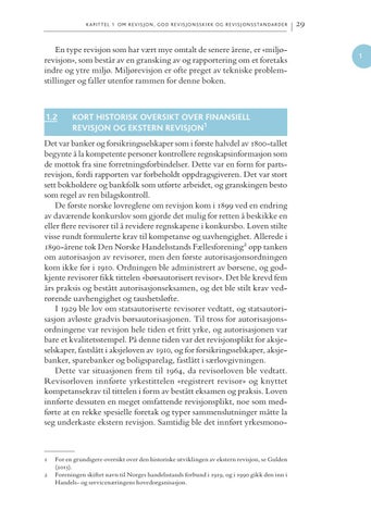 Det var banker og forsikringsselskaper som i første halvdel av 1800-tallet begynte å la kompetente personer kontrollere regnskapsinformasjon som de mottok fra sine forretningsforbindelser. Dette var en form for parts revisjon, fordi rapporten var forbeholdt oppdragsgiveren. Det var stort sett bokholdere og bankfolk som utførte arbeidet, og granskingen besto som regel av ren bilagskontroll. De første norske lovreglene om revisjon kom i 1899 ved en endring av daværende konkurslov som gjorde det mulig for retten å beskikke en eller flere revisorer til å revidere regnskapene i konkursbo. Loven stilte visse rundt formulerte krav til kompetanse og uavhengighet. Allerede i 1890-årene tok Den Norske Handelsstands Fællesforening2 opp tanken om autorisasjon av revisorer, men den første autorisasjonsordningen kom ikke før i 1910. Ordningen ble administrert av børsene, og god kjente revisorer fikk tittelen «børsautorisert revisor». Det ble krevd fem års praksis og bestått autorisasjonseksamen, og det ble stilt krav ved rørende uavhengighet og taushetsløfte. I 1929 ble lov om statsautoriserte revisorer vedtatt, og statsautori sasjon avløste gradvis børsautorisasjonen. Til tross for autorisasjons ordningene var revisjon hele tiden et fritt yrke, og autorisasjonen var bare et kvalitetsstempel. På denne tiden var det revisjonsplikt for aksje selskaper, fastslått i aksjeloven av 1910, og for forsikringsselskaper, aksje banker, sparebanker og boligsparelag, fastlått i særlovgivningen. Dette var situasjonen frem til 1964, da revisorloven ble vedtatt. Revisorloven innførte yrkestittelen «registrert revisor» og knyttet kompetansek rav til tittelen i form av bestått eksamen og praksis. Loven innførte dessuten en meget omfattende revisjonsplikt, noe som med førte at en rekke spesielle foretak og typer sammenslutninger måtte la seg underkaste ekstern revisjon. Samtidig ble det innført yrkesmono
