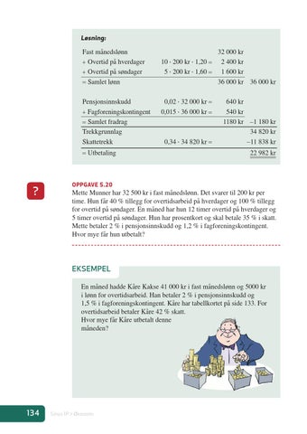 EKSEMPEL En måned hadde Kåre Kakse 41 000 kr i fast månedslønn og 5000 kr i lønn for overtidsarbeid. Han betaler 2 % i pensjonsinnskudd og 1,5 % i fagforeningskontingent. Kåre har tabellkortet på side 133. For overtidsarbeid betaler Kåre 42 % skatt. Hvor mye får Kåre utbetalt denne måneden?