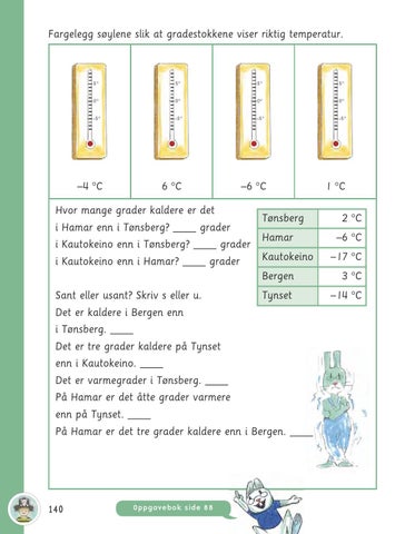 Hvor mange grader kaldere er det Tønsberg i Hamar enn i Tønsberg? _ grader Hamar i Kautokeino enn i Tønsberg? _ grader Kautokeino i Kautokeino enn i Hamar? _ grader Bergen Tynset Sant eller usant? Skriv s eller u. Det er kaldere i Bergen enn i Tønsberg. _ Det er tre grader kaldere på Tynset enn i Kautokeino. _ Det er varmegrader i Tønsberg. _ På Hamar er det åtte grader varmere enn på Tynset. _ På Hamar er det tre grader kaldere enn i Bergen. _