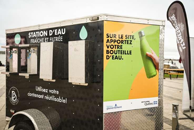 Deux (2) stations fixes et une station mobile d’eau fraîche et filtrée située sur le site des Délices d’automne étaient clairement identifiées aux couleurs de RECYC QUÉBEC. Les festivaliers ont d’ailleurs été invités à apporter leur contenant réutilisable, ou encore à se procurer un verre réutilisable consigné disponible aux billetteries et aux trois bistros SAQ.