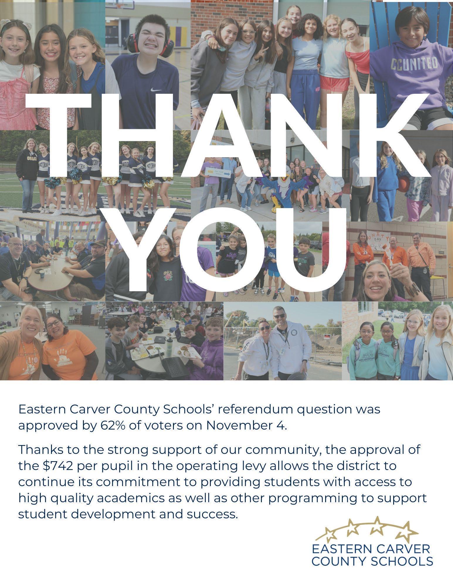 On November 4, voters approved the district referendum for Eastern Carver County Schools. The question, a $742 per pupil increase in the operating levy, was approved by 62 percent of voters.